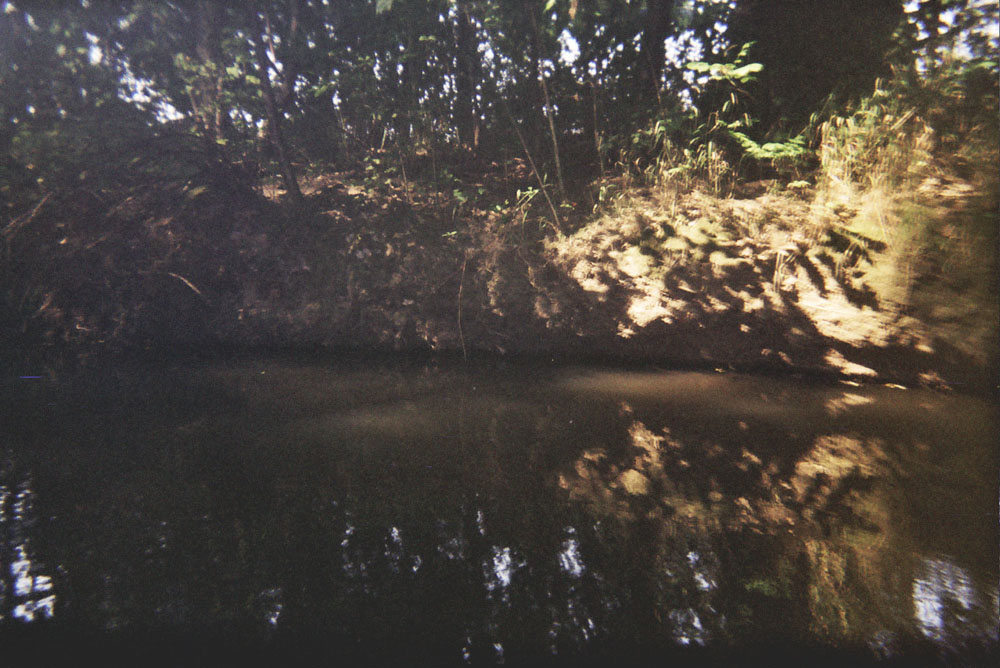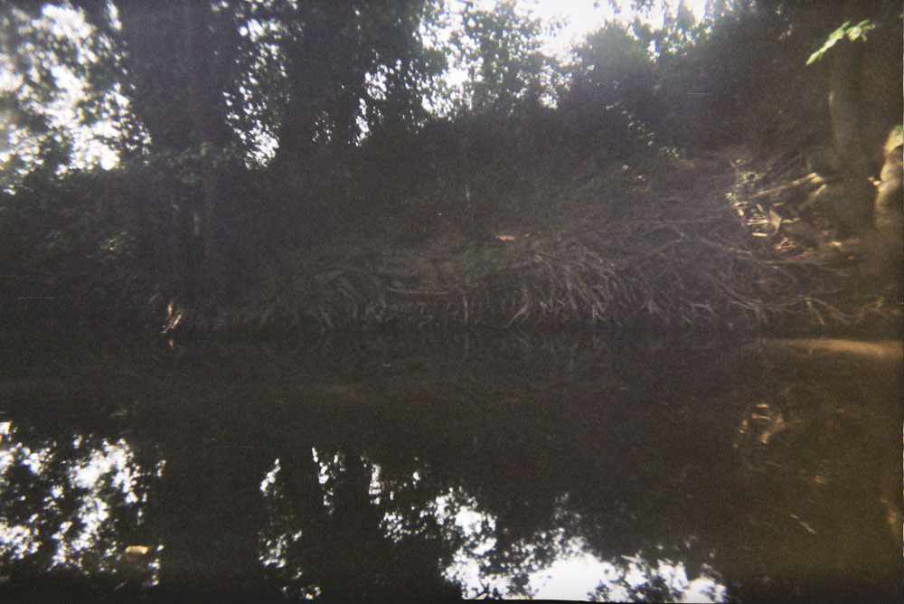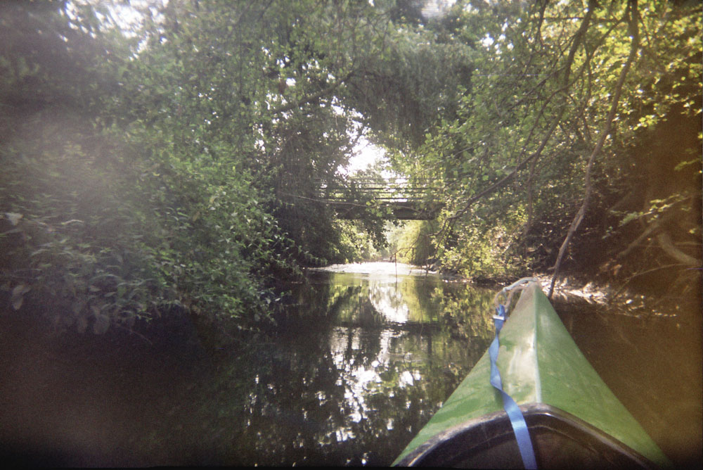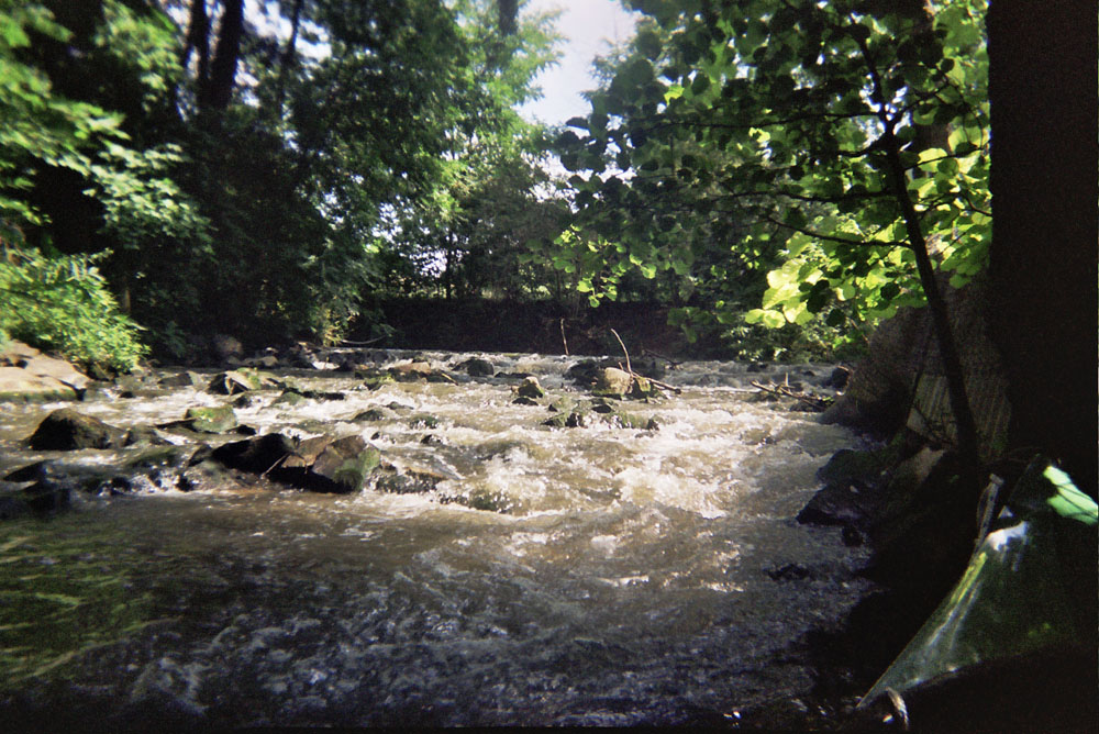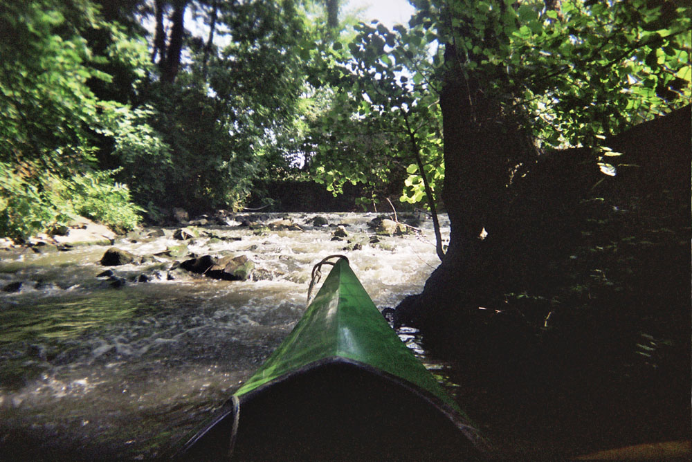 Dementgegen ist der Bach durchaus mächtig. Er kann das Boot am unterspülten Prallhang (Bild 15) eines Mäanders problemlos unter Wasser drücken. Kippt das Boot ein wenig gegen die Fließrichtung (weil ich Idiot mich in die Kurve gelegt habe), geht es nicht unter - es wird unter Wasser gerissen. Und mag man den Bach auch da und dort durchwaten können, gibt es doch genausooft Stellen mit 3m Wassertiefe.
